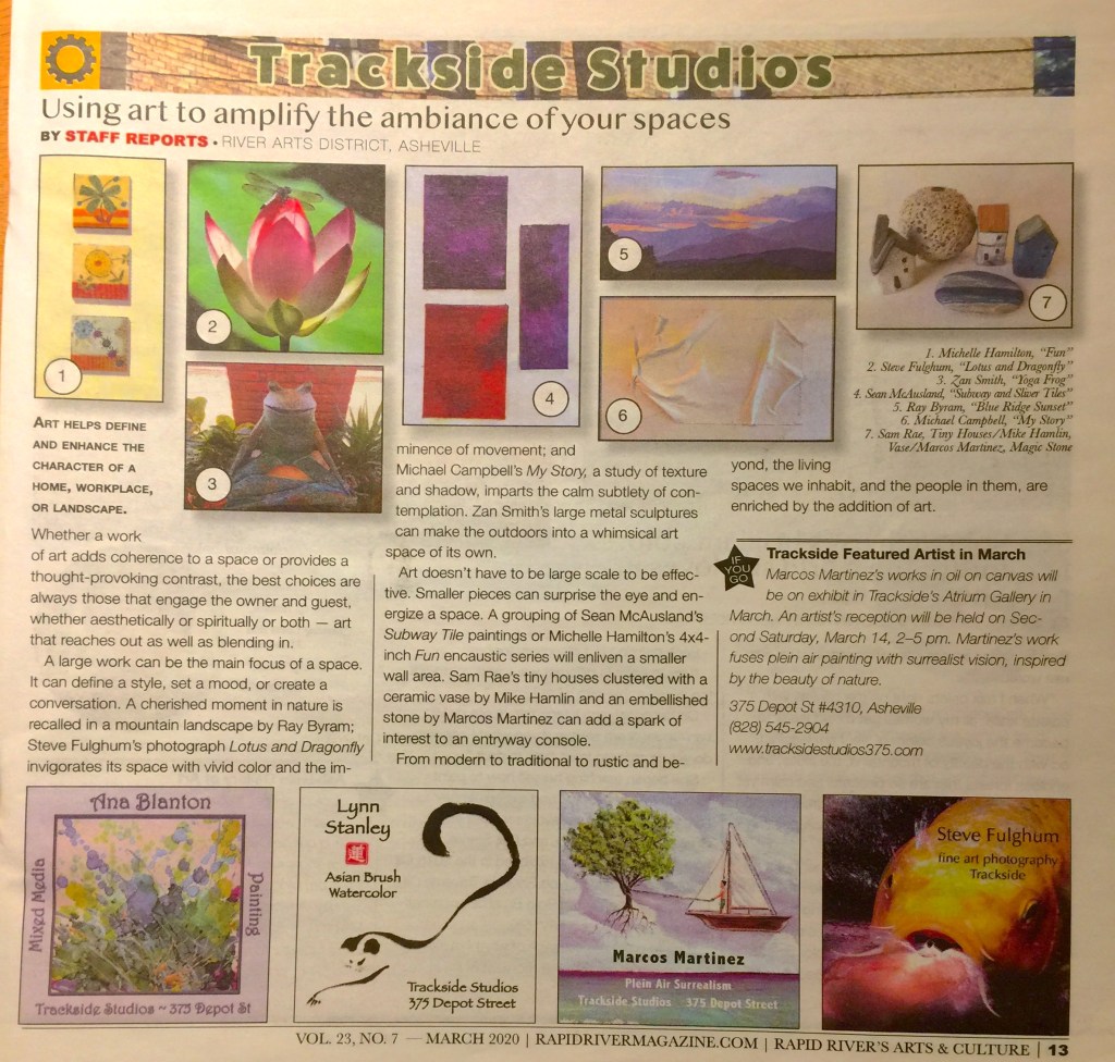 My small works received a mention in the March 2020 issue of Rapid River Magazine’s Arts & Culture. “Sean McAusland’s ‘Subway Tiles’… will enliven a smaller wall area.” Smaller pieces are more affordable and they can be combined in various placements and color juxtapositions for an engaging visual aesthetic. The article features several Trackside Studio artists.